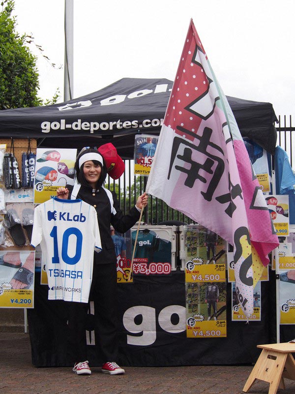 Eccola qui, infatti, Sanae Nakazawa in carne e ossa, con tanto di divisa maschile, hachimaki legato sulla fronte e l’immancabile bandierone, che ha cucito per la prima partita del suo adorato capitano!