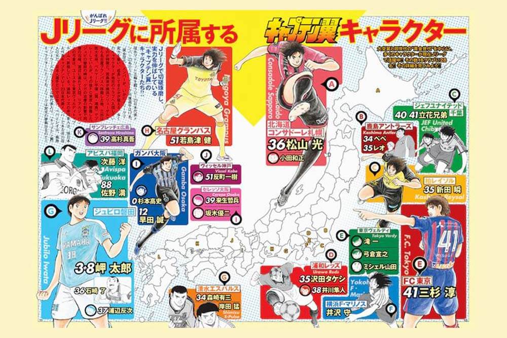 Sulla maglietta di Tsubasa campeggia la scritta “Va mos! J League!!”, mentre, intorno a lui, possiamo vedere, tra gli altri, Taro Misaki con la casacca celeste della Jubilo Iwata, Jun Misugi con la maglia rossa e blu della FC Tokyo, Hikaru Matsuyama con quella rossonera della Consadole Sapporo. Sulla doppia pagina, troviamo una dettagliata cartina con le squadre del campionato giapponese in cui militano i nostri beniamini.